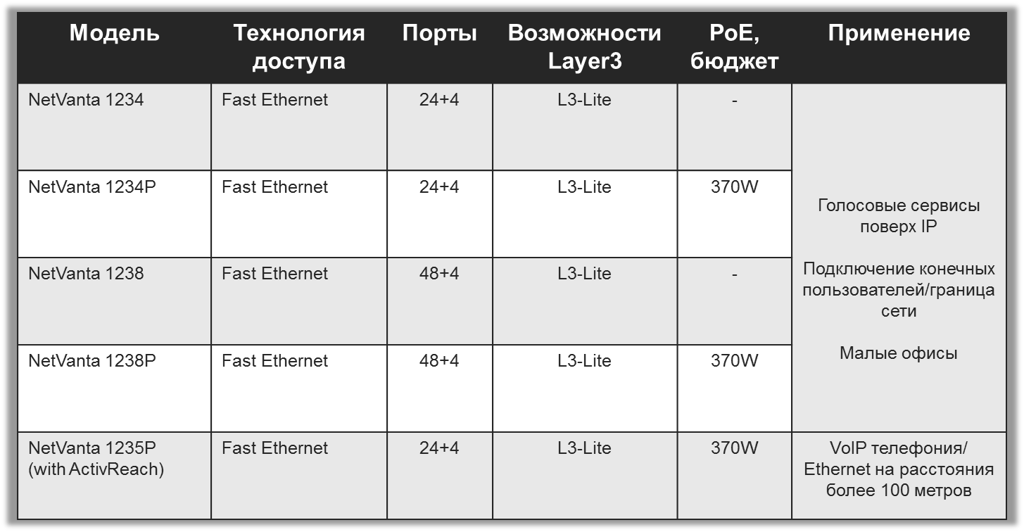 24-х и 48-портовые (Layer 3 lite) Fast Ethernet коммутаторы для развертывания услуги VoIP серии NetVanta 1200. Ethernet коммутаторы 1200 серии идеально подходят для малого и среднего бизнеса, а также для распределенных сетей предприятия. Решения с использованием коммутаторов 1200 серии являются экономически выгодными и отвечают высоким требованиям к построению сети, в том числе наличие возможности расширения полос частот, передача голоса посредством IP (VoIP) и обеспечение безопасности сети.